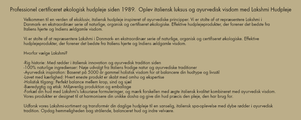 Professionel certificeret økologisk hudpleje siden 1989. Oplev italiensk luksus og ayurvedisk visdom med Lakshmi Hudpleje
